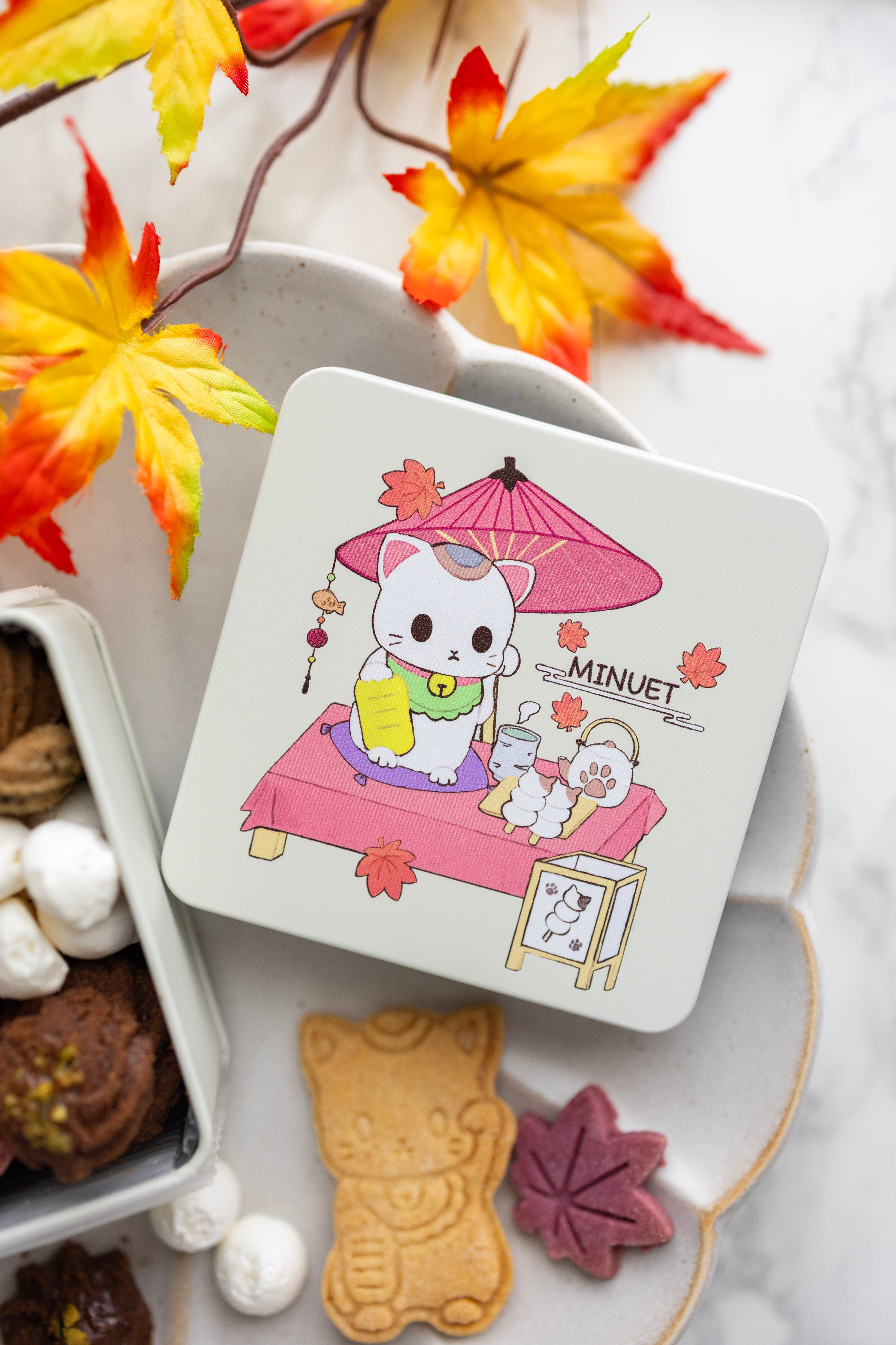 「猫のお団子屋さんでお客さまをお出迎えする招き猫」をテーマにデザインした、季節限定のミニクッキー缶です。