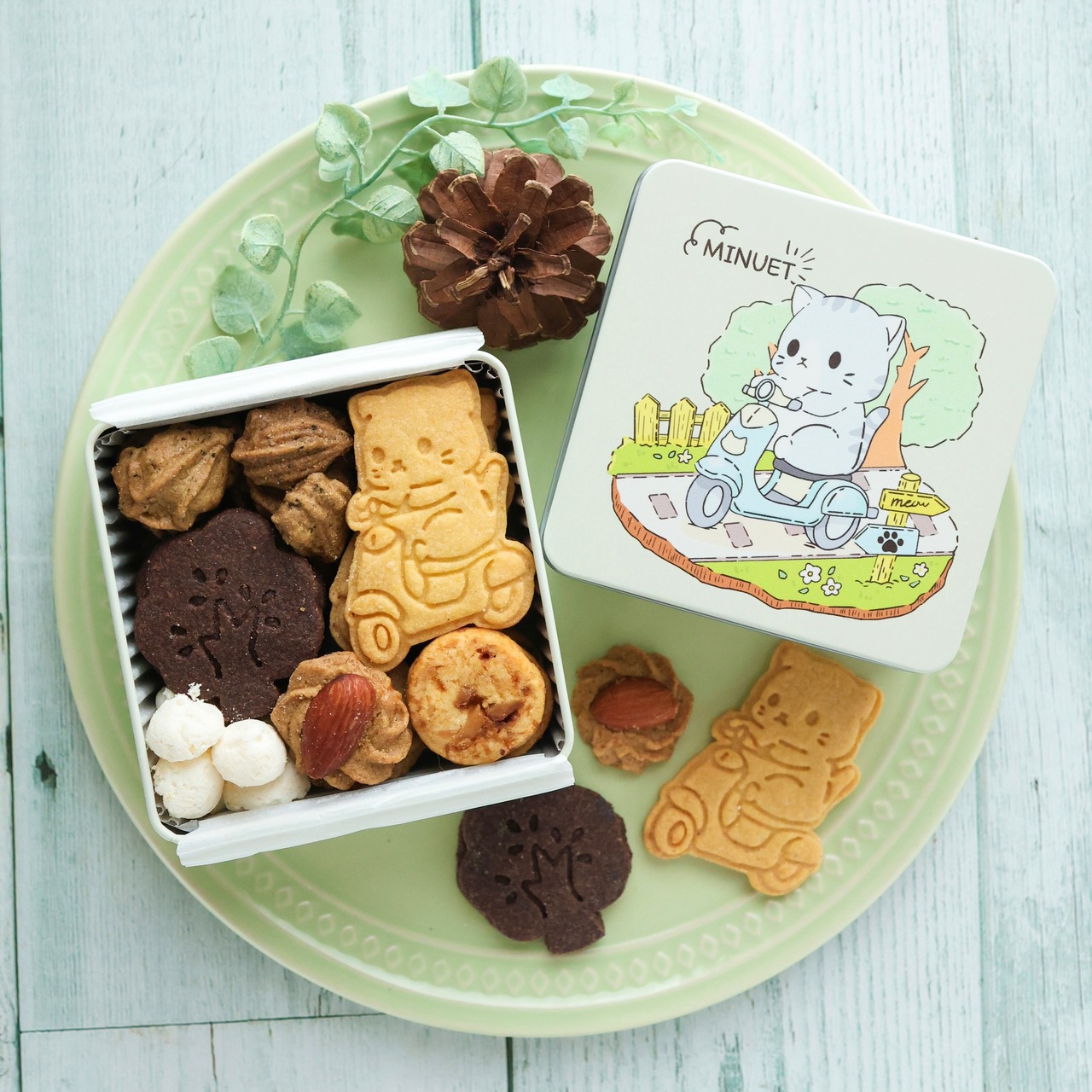 素材と風味にこだわった、原付に乗った猫ちゃんをモチーフにしたクッキーを入れました。